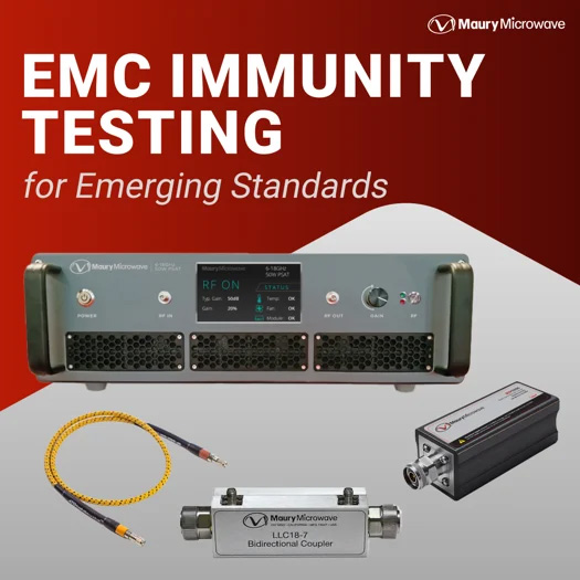 Unlock precise and reliable electromagnetic compatibility (EMC) immunity testing that satisfies emerging high-frequency standards with solutions from Maury Microwave. Product categories include amplifiers with wideband ranges and outstanding linearity; power sensors with fast measurement speed and industry-leading performance for high-integrity testing; phase-stable and amplitude-stable cable assemblies; and low-loss, high-power couplers. These best-in-class solutions provide the performance necessary for modern EMC testing.