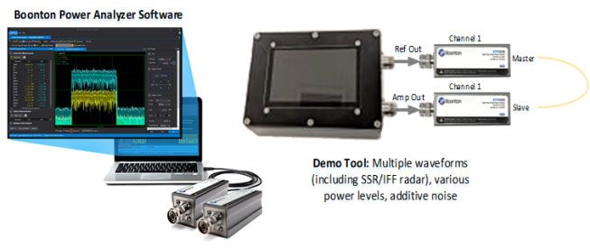 This demonstration highlights the capabilities of the Boonton RTP 5000 series of USB real-time RF/microwave power sensors. A pulsed signal is provided either unmodulated or modulated with noise (simulating OFDM) is sampled (Ref Out) and provided to a DUT (amplifier) whose output power is being measured (Amp Out). The pulsed signal can be of various types, including a basic ~500 ns,/100 kHz PRF signal, a 10 µs/1 kHz PRF (with and without a 600 ns dropout), an IFF simulating pulse, … Measurements are synchronized between sensor through trigger I/O ports in a master/slave configuration.