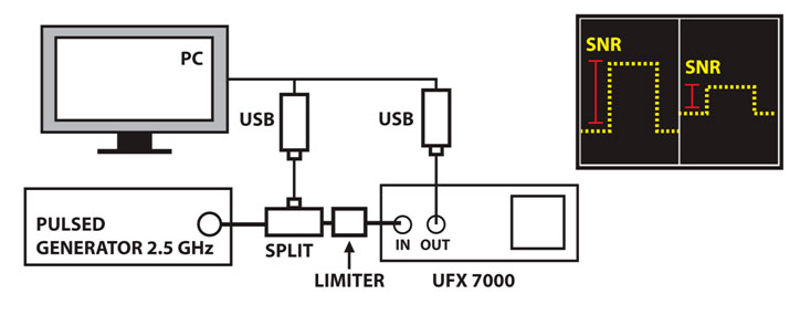 Limiters are used to protect sensitive components such as LNAs and radar receivers. This demonstration shows the effect that limiters have on the crest factor of your signal as its level is increased. The pulse generator has an internal noise source which is used to simulate a WLAN or LTE signal. The UFX7000 is used to simulate an LNA, and shows how crest factor is affected as signal and noise levels are varied.