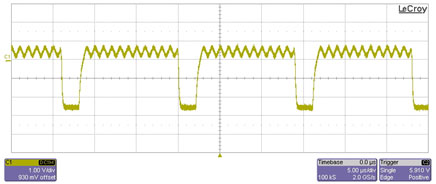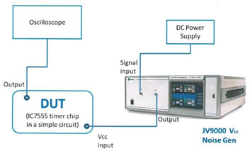 DUT is a 555 timer circuit generating a clock signal. The supply voltage to the DUT is passed through JV9000 and effects of injecting broadband noise and CW tones at different frequencies are observed on an oscilloscope (Figure 2).